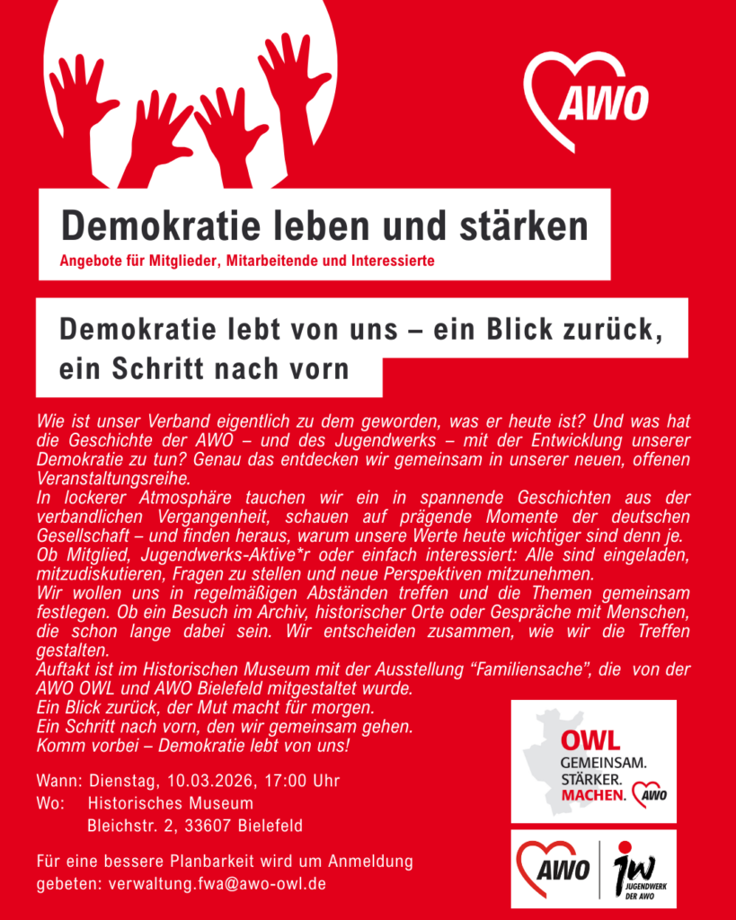 Wie ist unser Verband eigentlich zu dem geworden, was er heute ist? Und was hat die Geschichte der AWO – und des Jugendwerks – mit der Entwicklung unserer Demokratie zu tun? Genau das entdecken wir gemeinsam in unserer neuen, offenen Veranstaltungsreihe. Den Auftakt wollen wir mit der Ausstellung „Familiensache“ im Historischen Museum verknüpfen, die auch von der AWO OWL und dem KV Bielefeld mitgestaltet wurde.